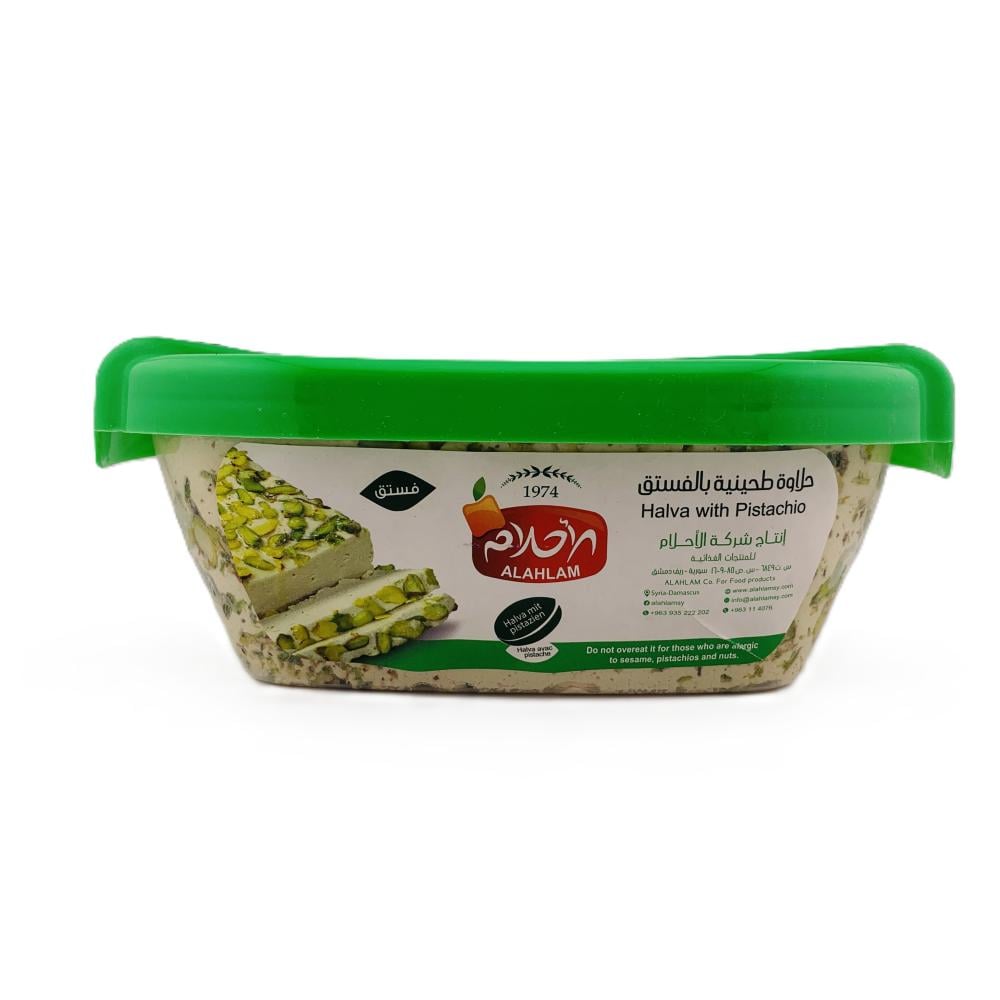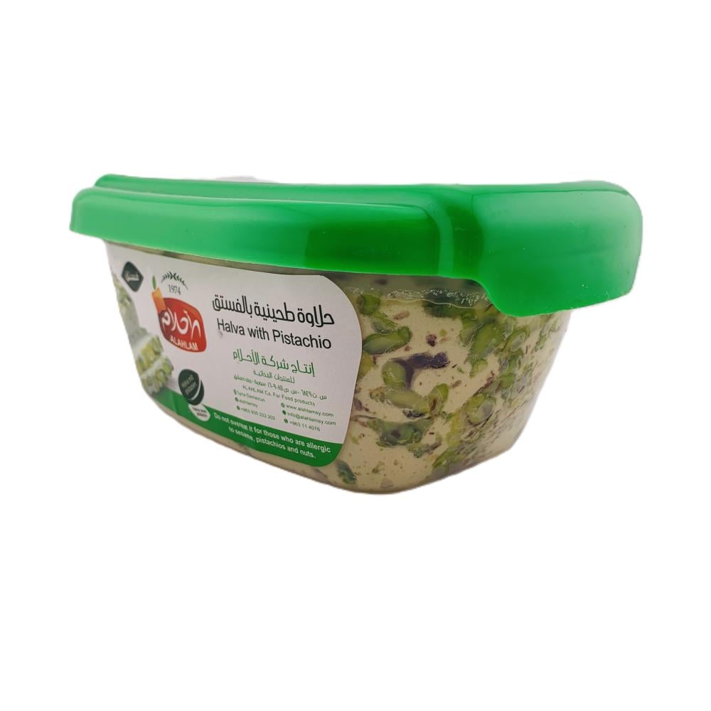 حلاوة طحينية فاخرة بالفستق من شركة الأحلام، مصنوعة من الطحينة مع الفستق الحلبي لتقديم نكهة غنية وقوام متماسك. مناسبة للتقديم على الإفطار أو كتحلية مع الشاي والقهوة.