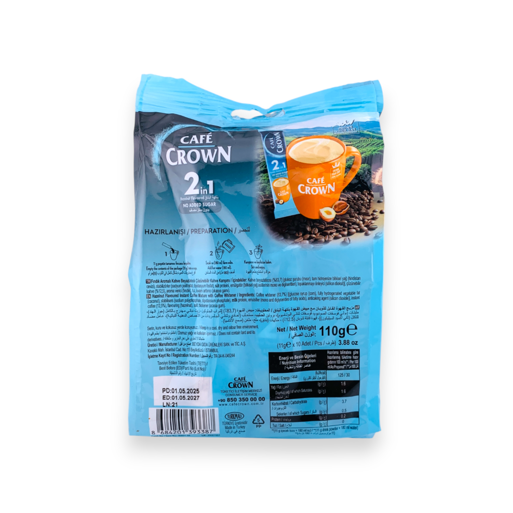 استمتع بمذاق القهوة الغني بنكهة البندق مع مبيض 2*1، بدون إضافة سكر مضاف. عبوة تحتوي على 10 أظرف سهلة التحضير، مثالية لمن يحبون القهوة الكريمية بدون سكر.