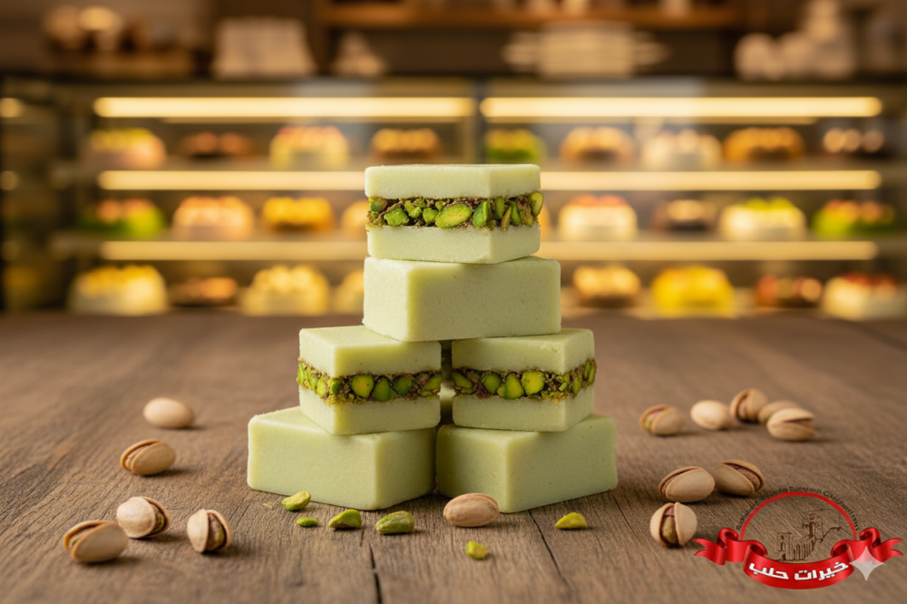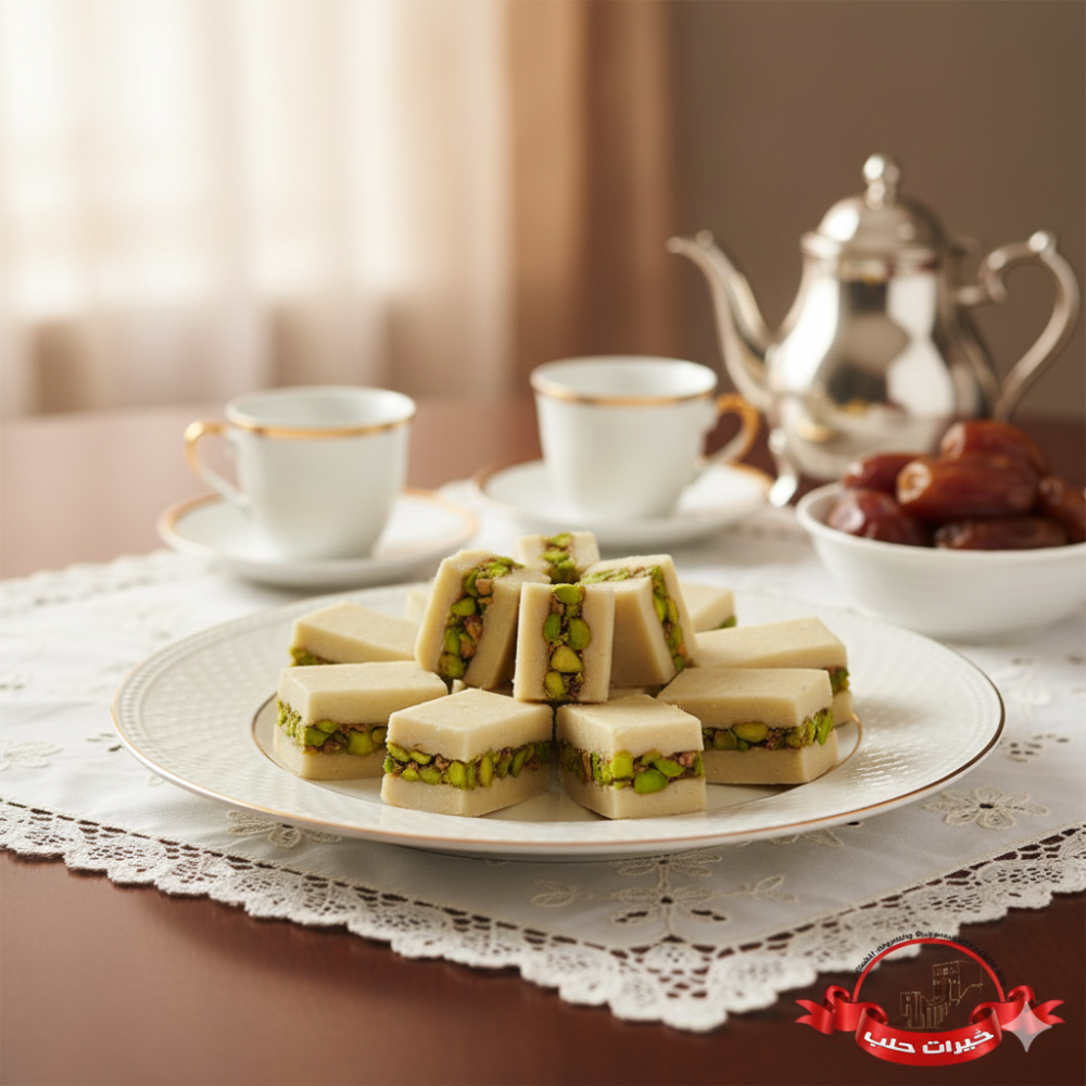أصابع لوزينا بالفستق الحلبي حب، محضرة من هريسة اللوز الغنية والمزينة بحبات الفستق الكاملة، مثالية للضيافة والمناسبات.