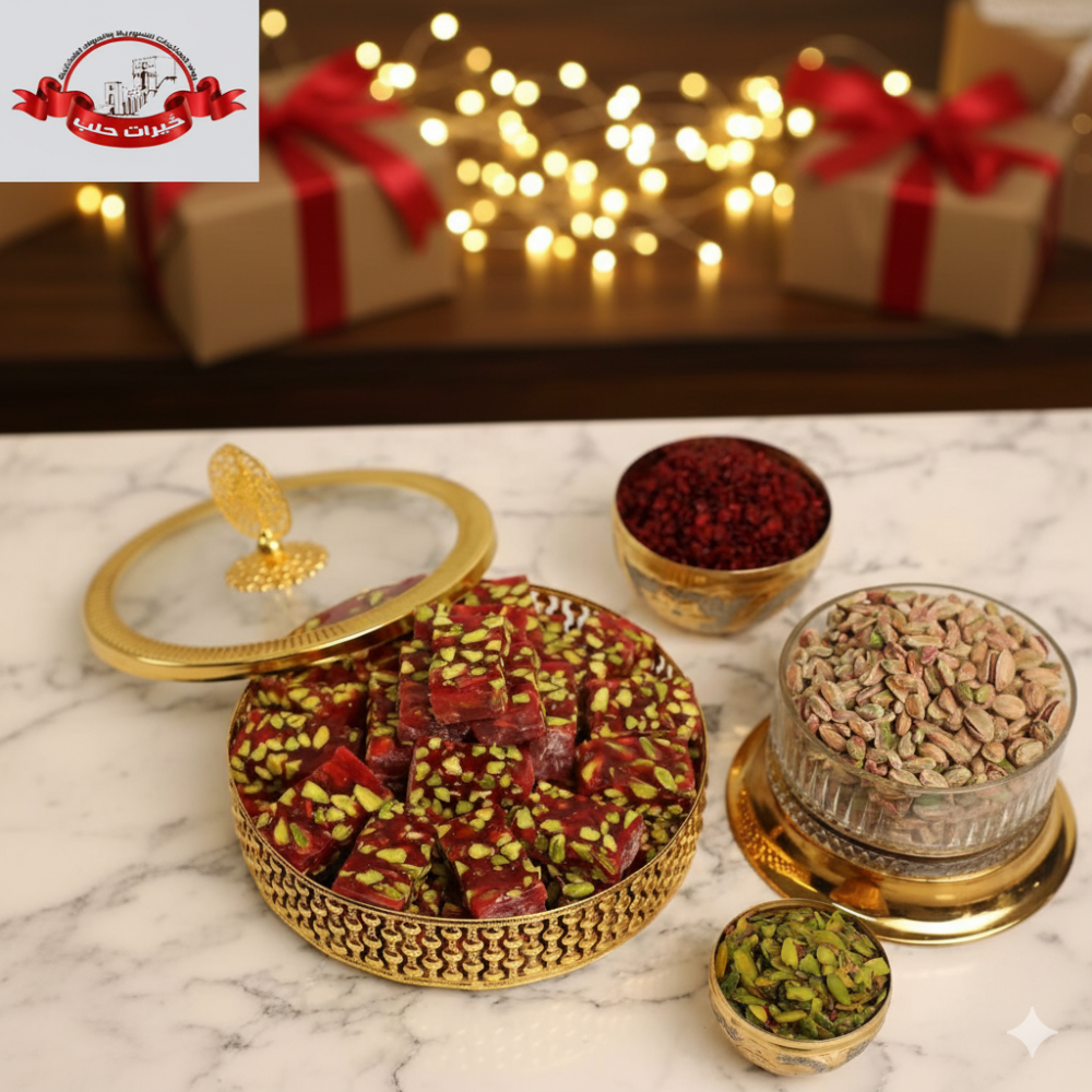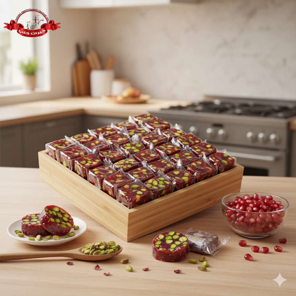 راحة الحلقوم الفاخرة، مضاف إليها الفستق الحلبي ونكهة الرمان الطبيعية، تقدم طعمًا غنيًا وقوامًا طريًا يجمع بين الحلاوة واللذة. مثالية للتحلية بعد الوجبات، للضيافة، أو لتقديمها مع القهوة والشاي.