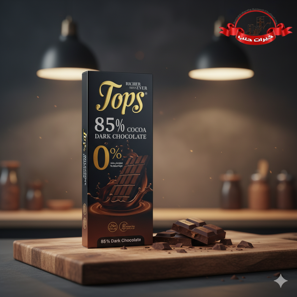 شوكولاتة داكنة من توبس بنسبة 85% كاكاو، خالية من السكر، بطعم مركز وغني لعشاق الشوكولاتة الداكنة الصحية. عبوة 60 جم.